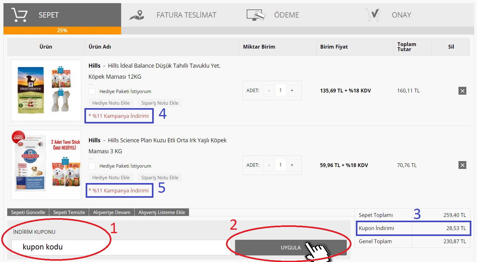 6-) İndirim tüm ürünlere uygulanmamış olabilir. ( Kampanya kodu ürün bazında ya da sepet toplam fiyatı bazında olabilir.) Bunu 4 ve 5 numara ile belirtilen mavi bölümlerden kontrol edebilirsiniz.