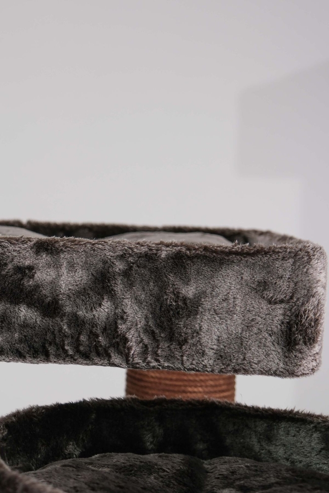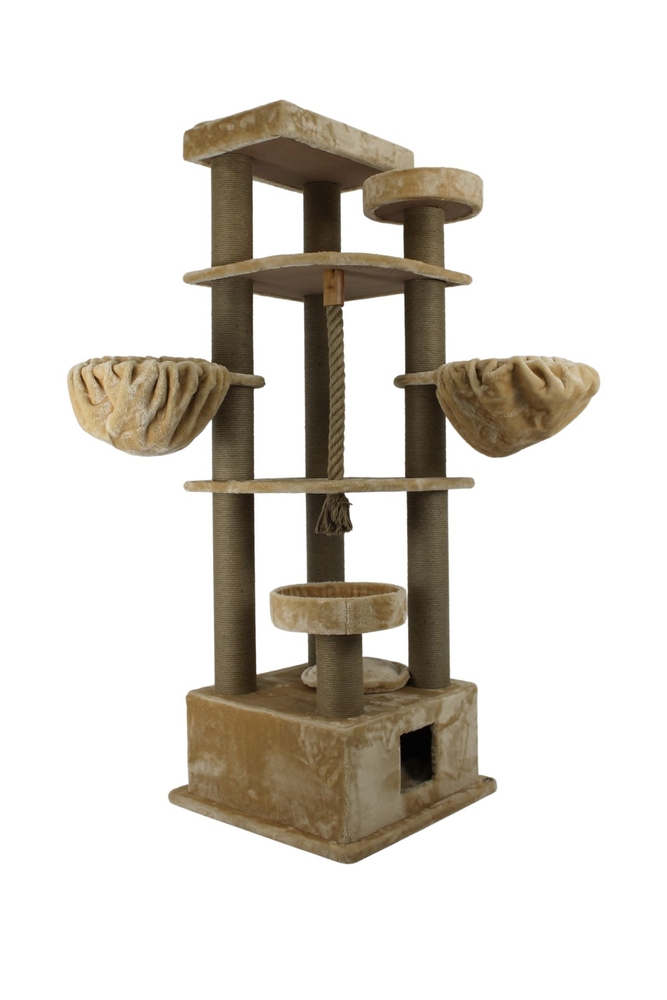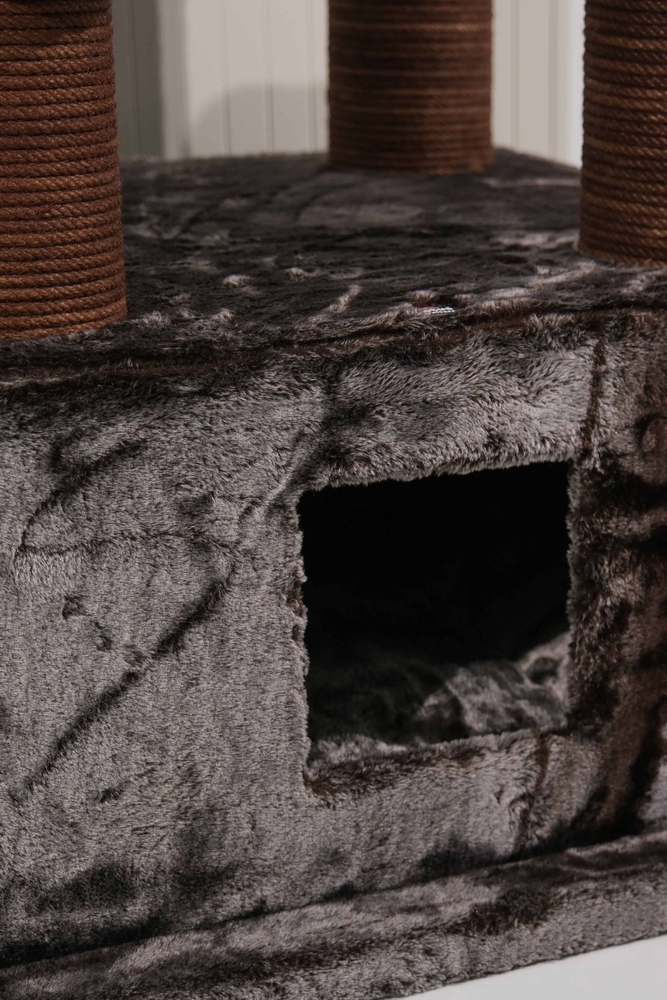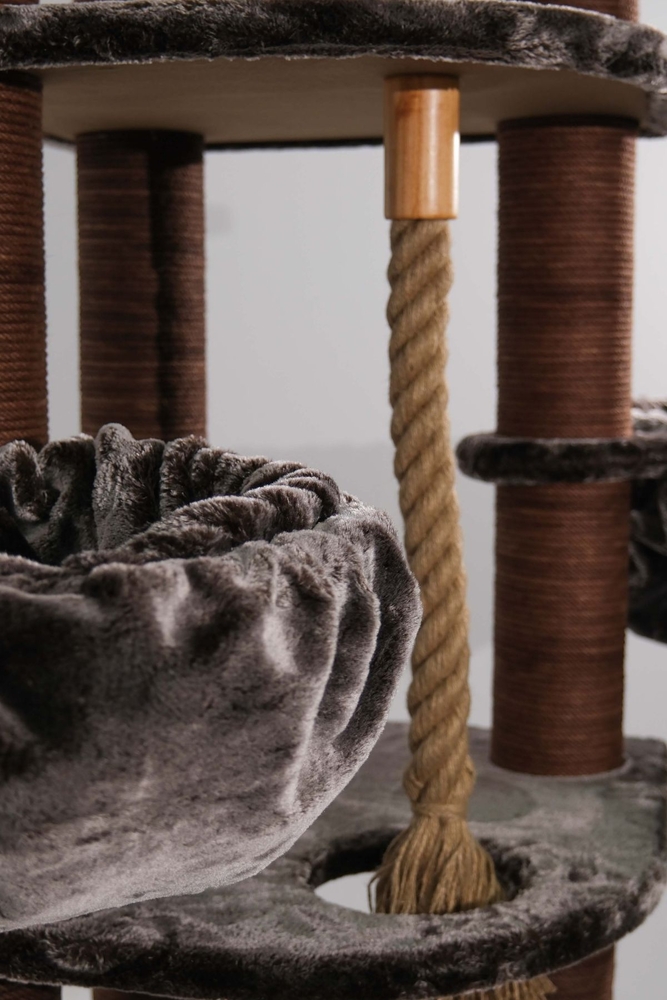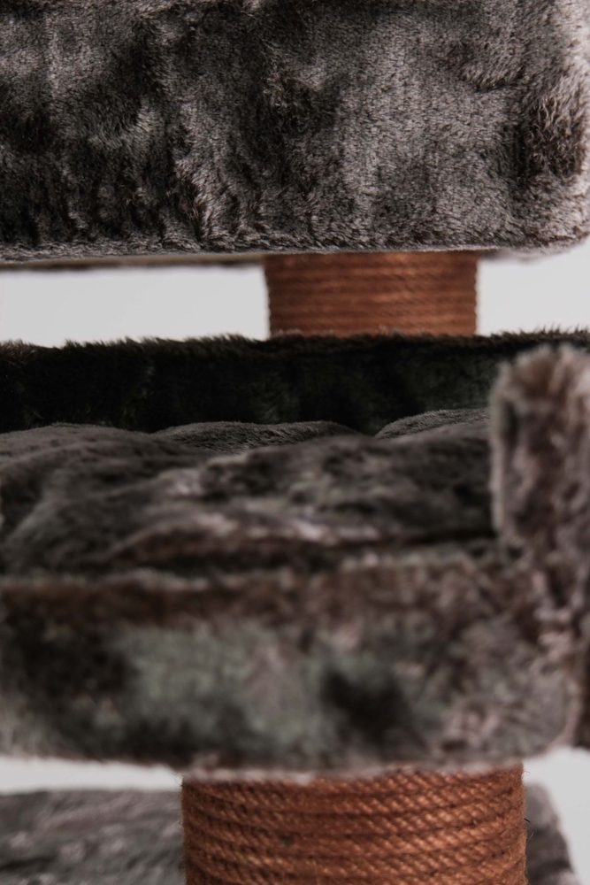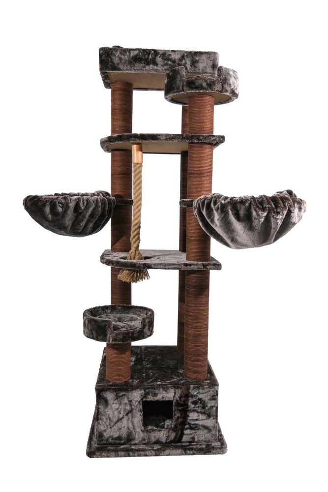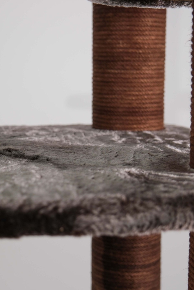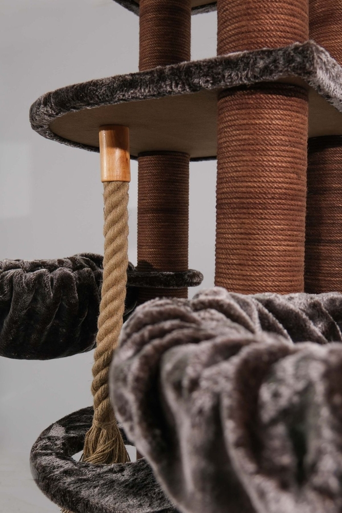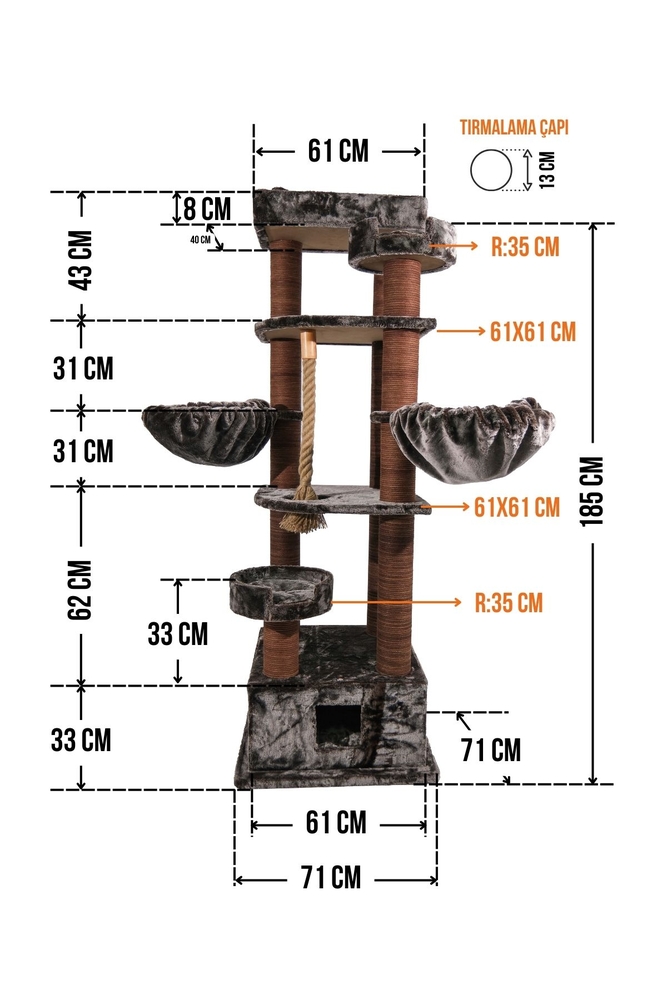 - Tırmalama direklerinde kullanılan 6mm doğal jüt halat, masuralara her noktadan yapıştırılarak sağlamlık en üst düzeye çıkarılmıştır. Tırmalama direklerinin alt ve üst kapaklarında MDF kullanılmaktadır.