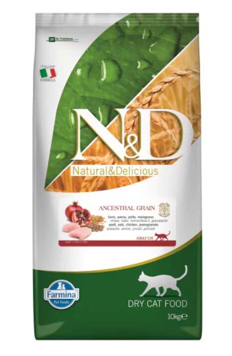 Farmina N&D Natural Delicious Düşük Tahıllı Tavuklu Narlı Yetişkin Kedi Maması 10 KgKılçıksız buğday, yulaf, tavuk, nar. Yetişkin kediler için formüle edilmiş tam mamadır.BİLEŞİMİTaze kemiksiz tavuk eti (%24), kurutulmuş tavuk eti (%24), kılçıksız buğday (%10), yulaf (%10), tavuk yağı, kurutulmuş tüm yumurta, taze ringa balığı, kurutulmuş ringa balığı, balık yağı, hidrolize hayvansal proteinler, kurutulmuş pancar posası, bitkisel bezelye lifi, kurutulmuş havuç, kurutulmuş yonca, inulin, fruktooligosakkaritler, mannan-oligosakkarit, nar tozu (%0.5), kurutulmuş elma, ıspanak tozu, fisilyum (%0.3), frenk üzümü tozu, kurutulmuş tatlı portakal, yaban mersini tozu, sodyum klorür, kurutulmuş bira mayası, zerdeçal kökü (%0.2), glukozamin, kondroitin sülfat, kadife çiçeği özü (lutein kaynağı).