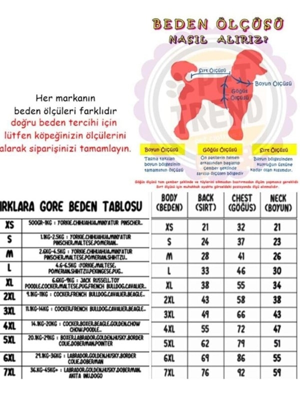 Kıyafet siparişlerinizde evcilinizin boyun ve göğüs kısmını bir ip yardımı ile ölçerek, ürün beden tablosundaki ölçülere göre doğru seçimi yapabilirsiniz. Ölçüler modellerde farklılık gösterebilir. Ürünlerde bulunan beden tablolarını baz alınız.