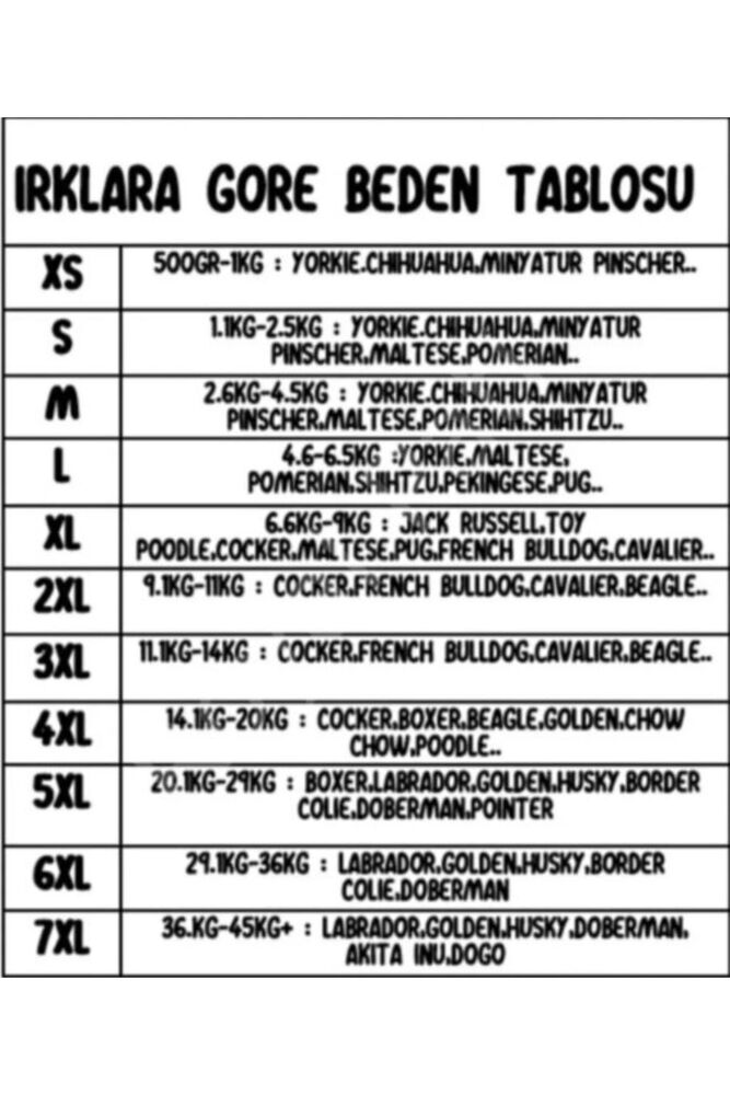 - Orta-Büyük Irk Köpekler için esnek Triko Kazak 3XL: 11,1 kg – 14 kg arasındaki köpeklere uygundur. French Bulldog, Cavalier King Charles, Beagle, Cocker, Poodle ve benzer ırk köpeklere uygundur. Göğüs: 58-66 cm, Sırt: 49 cm. 4XL: 14,1 kg – 20 kg arasındaki köpeklere uygundur. Beagle, Cocker, Boxer, Poodle, Golden Retriever, Chow Chow ve benzer ırk köpeklere uygundur. Göğüs: 66-72 cm, Sırt: 55 cm. 5XL: 20,1 kg – 29 kg arasındaki köpeklere uygundur. Doberman, Boxer, Golden Retriever, Labrador Retriever, Husky, Border Collie, Pointer ve benzer ırk köpeklere uygundur. Göğüs: 72-79 cm, Sırt: 62 cm. 6XL: 29,1 kg – 36 kg arasındaki köpeklere uygundur. Doberman, Golden Retriever, Labrador Retriever, Border Collie ve benzer ırk köpeklere uygundur. Göğüs: 79-86 cm, Sırt: 69 cm. 7XL: 36,1 kg – 45 kg arasındaki köpeklere uygundur. Doberman, Golden Retriever, Labrador Retriever, Husky, Akita ve benzer ırk köpeklere uygundur. Göğüs: 86-92 cm, Sırt: 76 cm. Belirtilen ırklar ve kg'lar yaklaşık değerlerdir. Aynı ırka sahip olsa da köpeklerimizin boyutları da değişkenlik gösterebilir. Bu nedenle lütfen köpeğinizin göğüs çevresi ve sırt uzunluğu ölçülerini alarak sipariş veriniz. Pawstar Esnek, Orta-Büyük Irk Köpek Kazağı hakkında: Yumuşacıktır, çok esnektir %50 Pamuk, %50 Polyester Bu kazak ile tüm gözlerin köpeğinizin üzerinde olacağına emin olabilirsiniz. Hepsipatili olarak köpeğinize ve size şimdiden, havalı gezmeler diliyoruz:)
