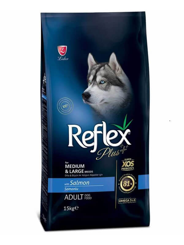 Reflex Plus for Medium & Large Breeds Adult Dog with Salmon, tüm yetişkin orta ve büyük ırklar için günlük beslenme ihtiyaçlarını karşılamak üzere kedi/köpek beslenme uzmanları tarafından özenle formüle edilmiş tam ve dengeli, balık proteini içeren süper premium köpek mamasıdır.
