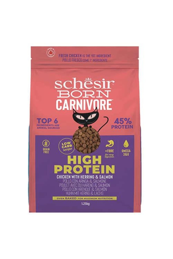 - Schesir Born Carnivore Tavuklu Somonlu ve Ringa Balıklı Tahılsız Kedi Maması 1,25 Kg •Avcı kedilerden ilham alan tarif –taptaze tavuk, ringa ve somon balıkları ile hazırlandı.•Tahıl içermez.•Özenle seçilen lezzetli tavuk filetoları ve balıklar ana malzeme olarak kullanılır.•Yüksek protein içerir: %43 garantili analiz sonucu olup kuru maddede %48 protein içerir.•Karbonhidratoranıdüşüktür–Ekstrüdemamaların içeriğindeki miktar %30-40 oranındayken, BornCarnivorebunun yarısından daha az karbonhidrat içerir.•İşlenmiş bitkisel protein içermez.•Yetişkin kediler için özel formülasyon:•Balık ve keten tohumundan gelen Omega 3 & 6 yönünden zengindir.•Kolay sindirimi destekleyen lifler ile geliştirilmiştir. Schesir kuru mamalar, kedilerin doğal ortamlarındaki beslenmelerine benzer bir beslenme sunar. Neden SchesirBorn Carnivore kedi beslenmesinde daha iyidir? Çünkü Schesir Born Carnivore taze et içerir ve ekstrüde edilmeden fırında pişirilir.