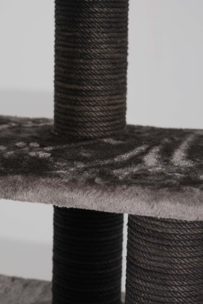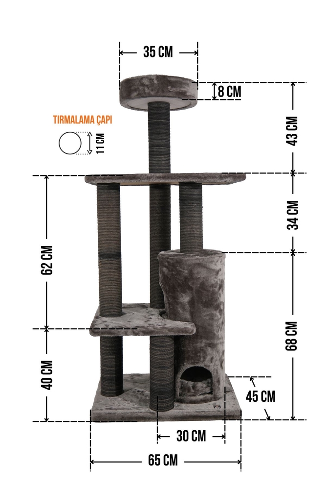 - Tırmalama direklerinde kullanılan 6mm doğal jüt halat, masuralara her noktadan yapıştırılarak sağlamlık en üst düzeye çıkarılmıştır. Tırmalama direklerinin alt ve üst kapaklarında MDF kullanılmaktadır.