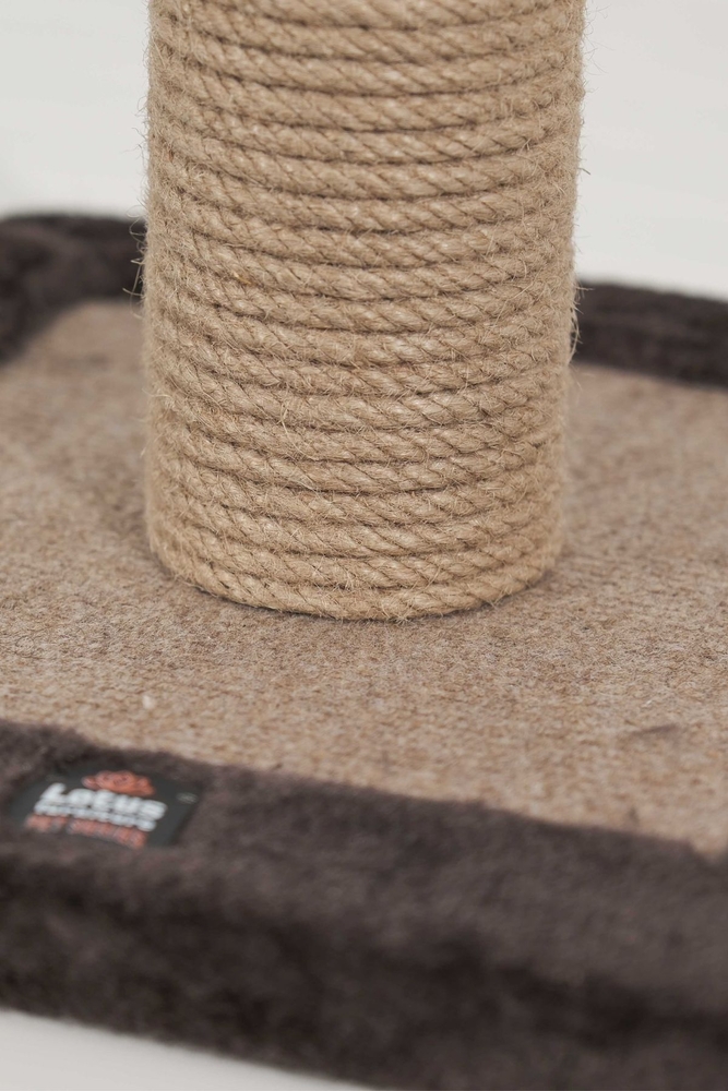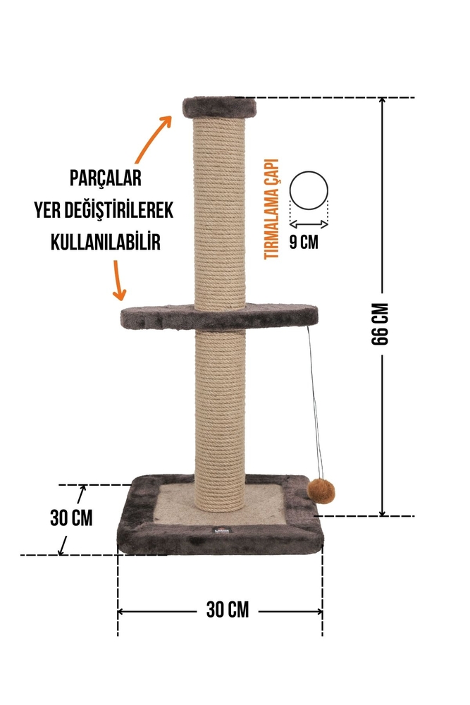 - Tırmalama direklerinde kullanılan 6mm doğal jüt halat, masuralara her noktadan yapıştırılarak sağlamlık en üst düzeye çıkarılmıştır. Tırmalama direklerinin alt ve üst kapaklarında MDF kullanılmaktadır.