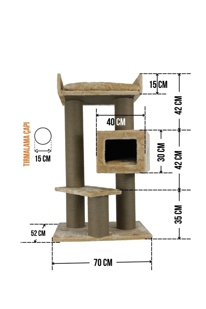 - Tırmalama direklerinde kullanılan 6mm doğal jüt halat, masuralara her noktadan yapıştırılarak sağlamlık en üst düzeye çıkarılmıştır. Tırmalama direklerinin alt ve üst kapaklarında MDF kullanılmaktadır.